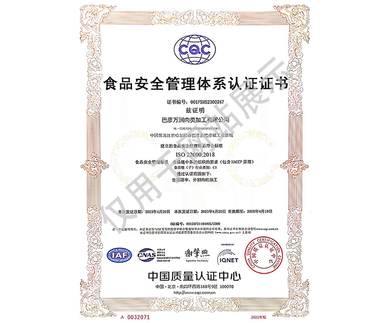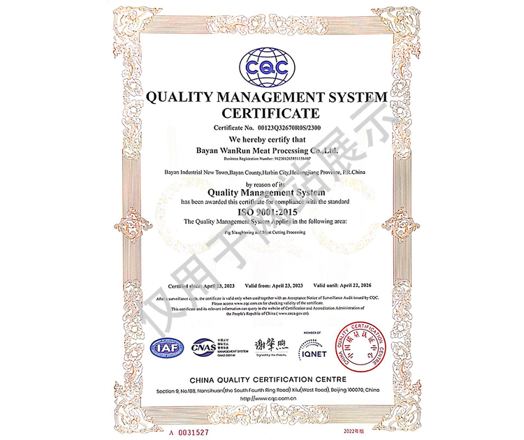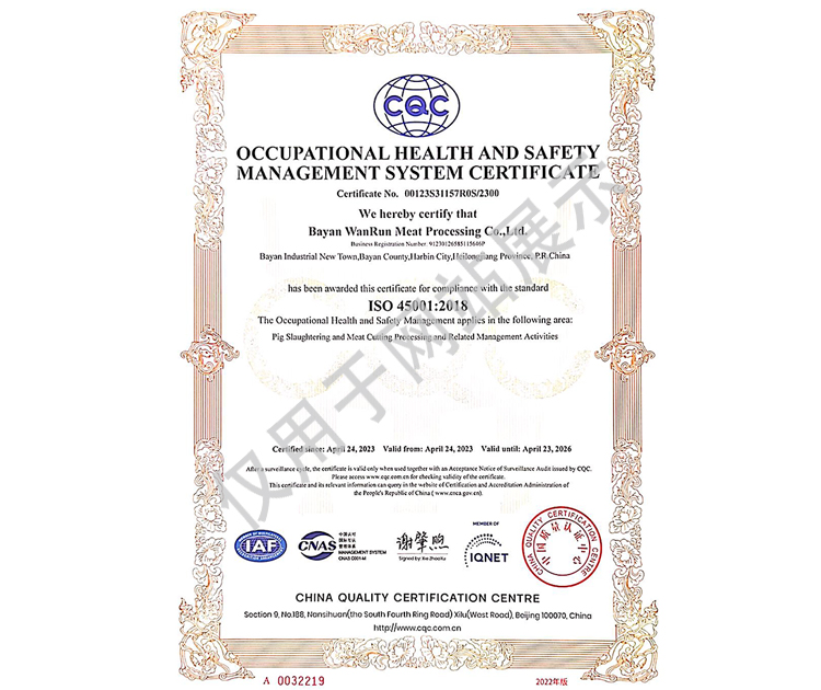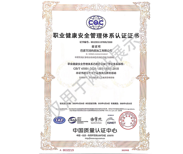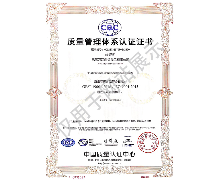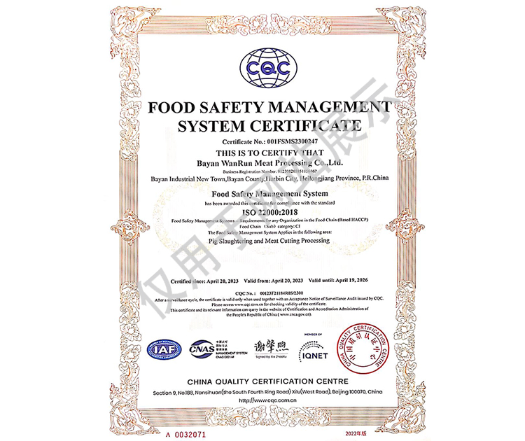 2016年公司通過了中國質(zhì)量認(rèn)證中心的質(zhì)量管理體系(ISO9001)和食品安全管理體系(ISO22000)認(rèn)證;2017年已取得國家進(jìn)出口企業(yè)認(rèn)證;是中國肉類協(xié)會(huì)會(huì)員單位,黑龍江省肉類協(xié)會(huì)副會(huì)長單位;2017年,公司產(chǎn)品經(jīng)中國綠色食品發(fā)展中心審核,被認(rèn)定為綠色食品A級(jí)產(chǎn)品;被省畜牧獸醫(yī)局確定為全國生豬屠宰標(biāo)準(zhǔn)化創(chuàng)建示范企業(yè)(全國僅6家)。2018年12月,被評(píng)定為市級(jí)農(nóng)業(yè)產(chǎn)業(yè)化重點(diǎn)龍頭企業(yè)。2019年1月,被評(píng)定為省級(jí)農(nóng)業(yè)產(chǎn)業(yè)化龍頭企業(yè)。