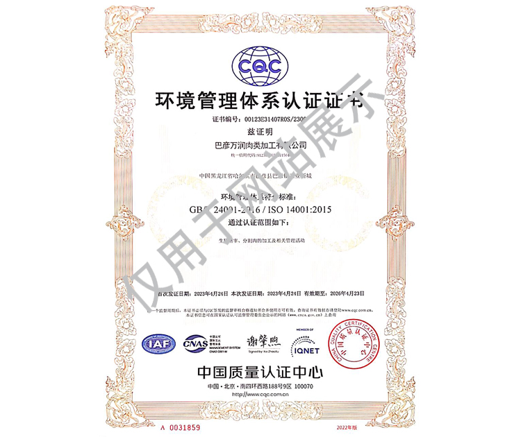 2016年公司通過了中國質(zhì)量認(rèn)證中心的質(zhì)量管理體系(ISO9001)和食品安全管理體系(ISO22000)認(rèn)證;2017年已取得國家進(jìn)出口企業(yè)認(rèn)證;是中國肉類協(xié)會(huì)會(huì)員單位,黑龍江省肉類協(xié)會(huì)副會(huì)長(zhǎng)單位;2017年,公司產(chǎn)品經(jīng)中國綠色食品發(fā)展中心審核,被認(rèn)定為綠色食品A級(jí)產(chǎn)品;被省畜牧獸醫(yī)局確定為全國生豬屠宰標(biāo)準(zhǔn)化創(chuàng)建示范企業(yè)(全國僅6家)。2018年12月,被評(píng)定為市級(jí)農(nóng)業(yè)產(chǎn)業(yè)化重點(diǎn)龍頭企業(yè)。2019年1月,被評(píng)定為省級(jí)農(nóng)業(yè)產(chǎn)業(yè)化龍頭企業(yè)。