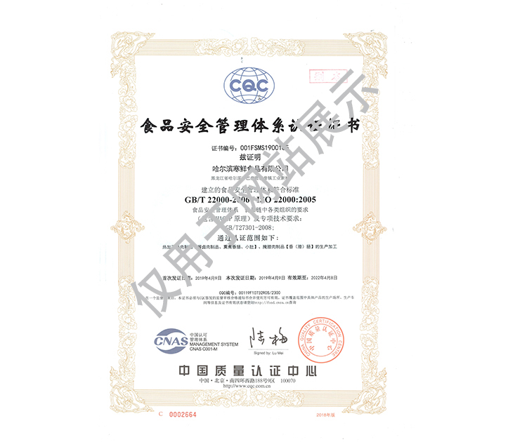 2016年公司通過(guò)了中國(guó)質(zhì)量認(rèn)證中心的質(zhì)量管理體系(ISO9001)和食品安全管理體系(ISO22000)認(rèn)證;2017年已取得國(guó)家進(jìn)出口企業(yè)認(rèn)證;是中國(guó)肉類協(xié)會(huì)會(huì)員單位,黑龍江省肉類協(xié)會(huì)副會(huì)長(zhǎng)單位;2017年,公司產(chǎn)品經(jīng)中國(guó)綠色食品發(fā)展中心審核,被認(rèn)定為綠色食品A級(jí)產(chǎn)品;被省畜牧獸醫(yī)局確定為全國(guó)生豬屠宰標(biāo)準(zhǔn)化創(chuàng)建示范企業(yè)(全國(guó)僅6家)。2018年12月,被評(píng)定為市級(jí)農(nóng)業(yè)產(chǎn)業(yè)化重點(diǎn)龍頭企業(yè)。2019年1月,被評(píng)定為省級(jí)農(nóng)業(yè)產(chǎn)業(yè)化龍頭企業(yè)。