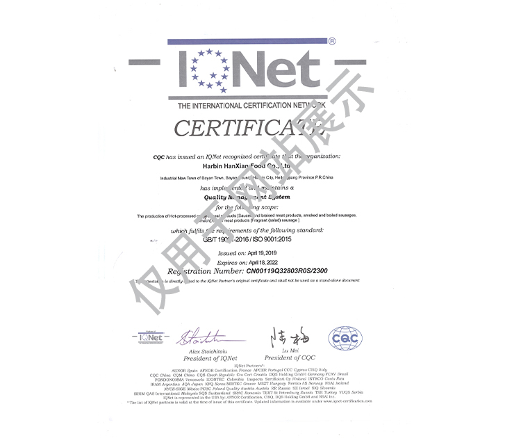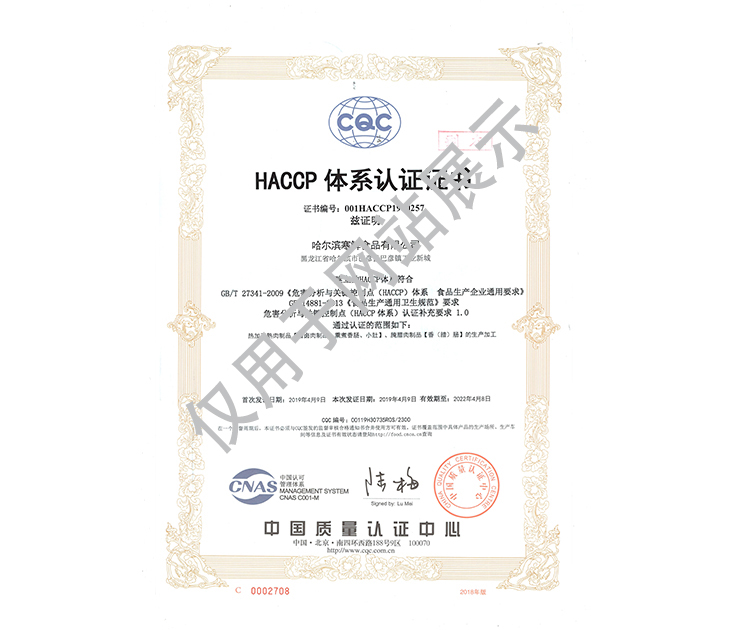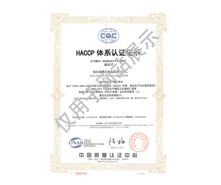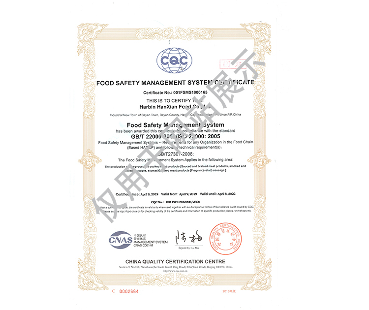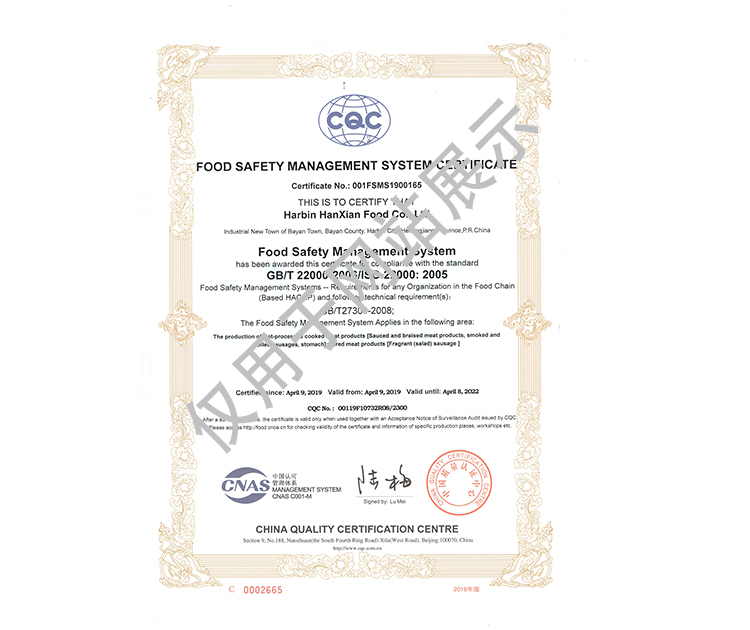 2016年公司通過了中國質(zhì)量認(rèn)證中心的質(zhì)量管理體系(ISO9001)和食品安全管理體系(ISO22000)認(rèn)證;2017年已取得國家進(jìn)出口企業(yè)認(rèn)證;是中國肉類協(xié)會(huì)會(huì)員單位,黑龍江省肉類協(xié)會(huì)副會(huì)長單位;2017年,公司產(chǎn)品經(jīng)中國綠色食品發(fā)展中心審核,被認(rèn)定為綠色食品A級(jí)產(chǎn)品;被省畜牧獸醫(yī)局確定為全國生豬屠宰標(biāo)準(zhǔn)化創(chuàng)建示范企業(yè)(全國僅6家)。2018年12月,被評(píng)定為市級(jí)農(nóng)業(yè)產(chǎn)業(yè)化重點(diǎn)龍頭企業(yè)。2019年1月,被評(píng)定為省級(jí)農(nóng)業(yè)產(chǎn)業(yè)化龍頭企業(yè)。