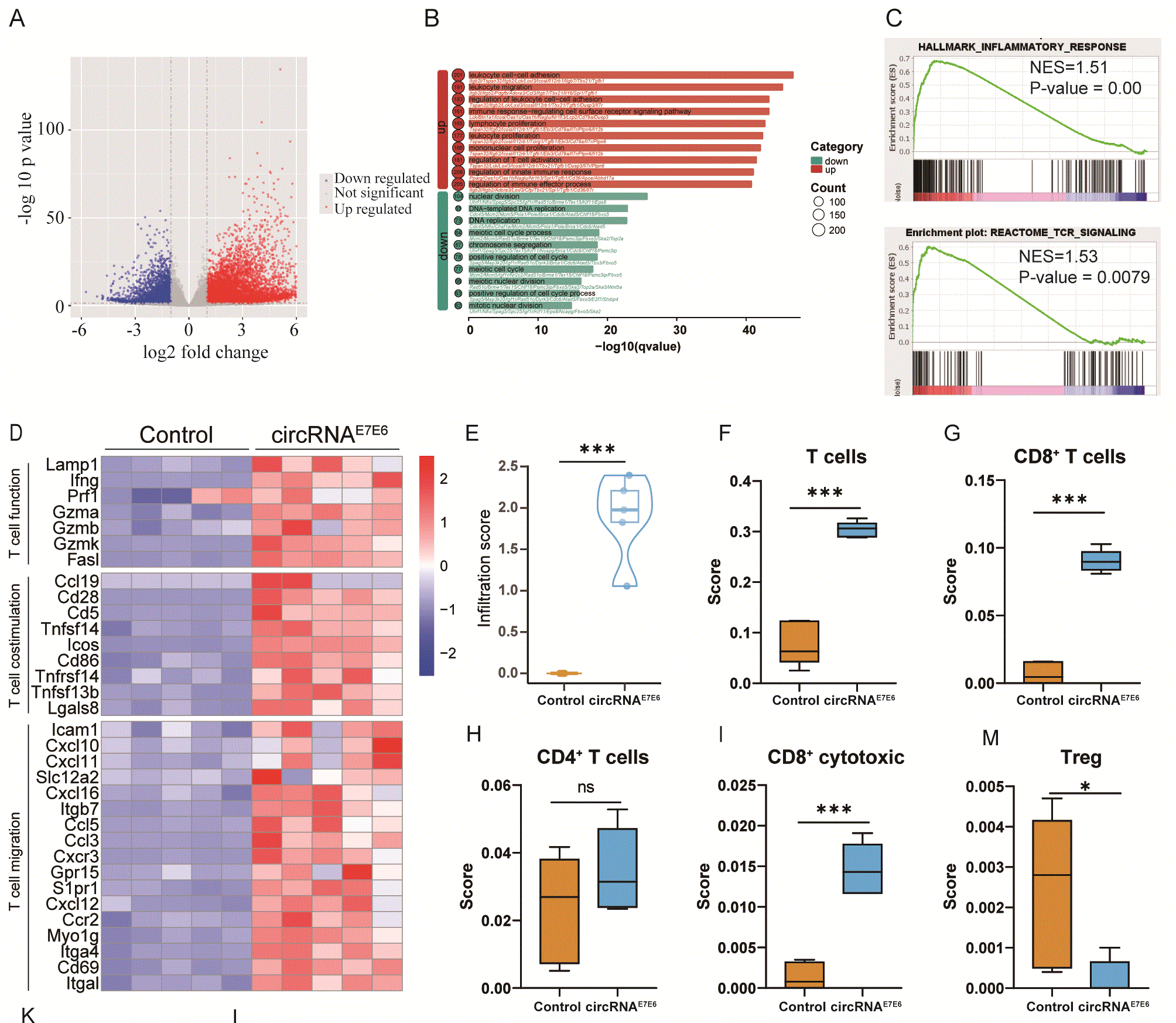在小鼠腫瘤模型研究中,研究團(tuán)隊(duì)為免疫功能正常小鼠皮下接種TC-1腫瘤細(xì)胞后,采用circRNAE7E6進(jìn)行免疫干預(yù),待腫瘤體積達(dá)到預(yù)設(shè)標(biāo)準(zhǔn)后采集腫瘤組織開展測序分析。RNA-Seq結(jié)果表明,circRNAE7E6可在腫瘤微環(huán)境中誘導(dǎo)強(qiáng)效抗腫瘤免疫反應(yīng),實(shí)現(xiàn)腫瘤局部活躍的免疫浸潤,具體表現(xiàn)為免疫激活基因顯著上調(diào)、免疫細(xì)胞大量浸潤,以及腫瘤微環(huán)境向促炎狀態(tài)偏移。